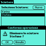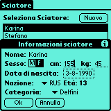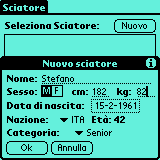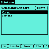 Tramite questa interfaccia, che riporta la lista di tutti gli sciatori registrati nel palmare, è possibile sia inserire i dati per la registrazione di un nuovo sciatore (pulsante Nuovo) sia visualizzare le informazioni relative ad uno sciatore registrato (pulsante Info). E' anche possibile eliminare uno sciatore dalla lista dei registrati (pulsante Elimina). |