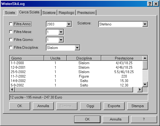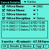 Il pulsante Oggi applica in automatico i filtri anno, mese e giorno per visualizzare le sciate eseguite in data odierna dallo sciatore. L'elenco delle sciate riporta, oltre al giorno in cui è avvenuta, il numero progressivo giornaliero della sciata, la disciplina e la prestazione registrata, per un facile riconoscimento. Selezionando una sciata dalla lista, tramite il pulsante OK è possibile visualizzarne i dettagli tramite l'interfaccia delle sciate; tramite il pulsante Elimina, è possibile cancellare la sciata dal database. |