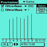 Tramite questa interfaccia si visualizza un istogramma che riporta la successione temporale delle migliori prestazioni ottenute dall'atleta nelle singole discipline, per gli anni dal 2000 al 2010. A seconda dello stato delle checkbox Filtra Anno e Filtra Mese, è possibile visualizzare la miglior prestazione ottenuta nel decennio, nell'anno o nel mese. Il cursore permette di spostarsi sulle singole linee dell'istogramma, per visualizzare il valore della prestazione. L'istogramma permette di visualizzare facilmente il trend di crescita (o di involuzione) dell'atleta, di evidenziare il periodo dell'anno in cui vi è un calo nelle prestazioni, ecc. |